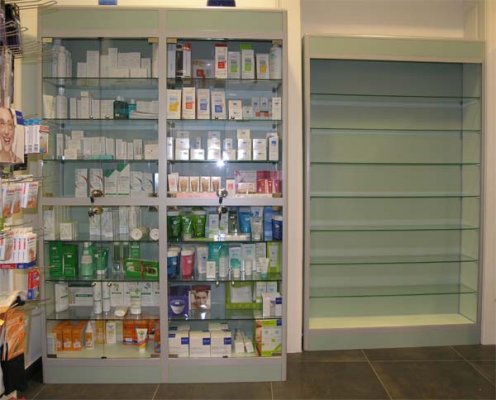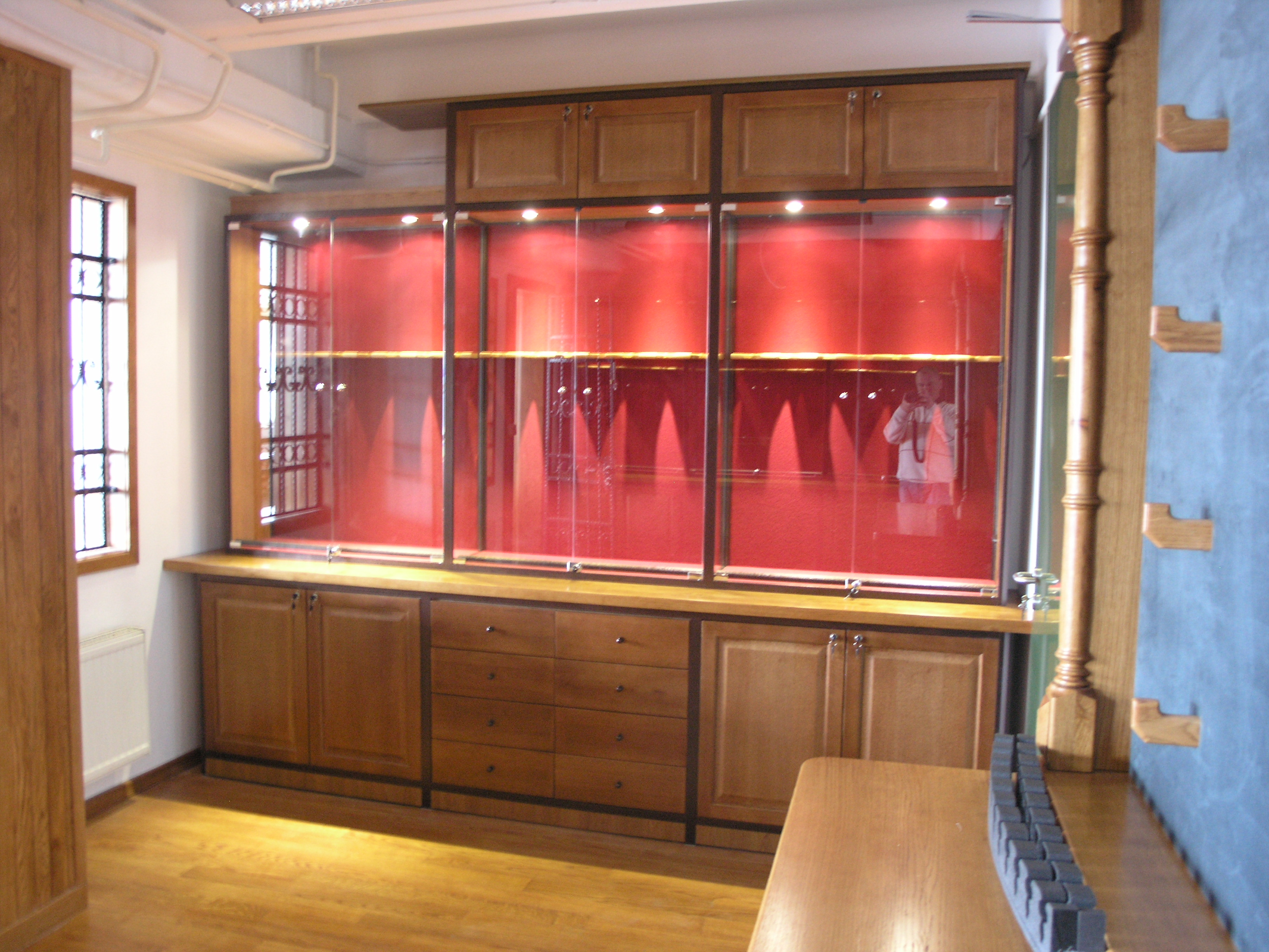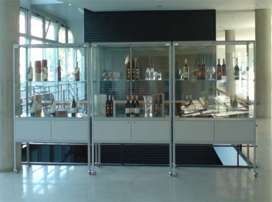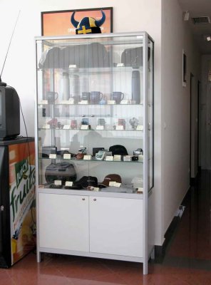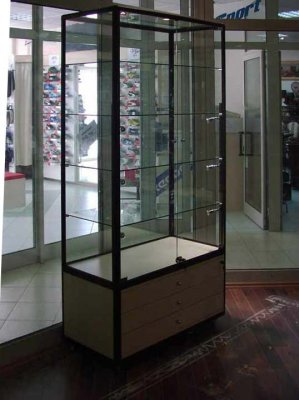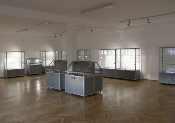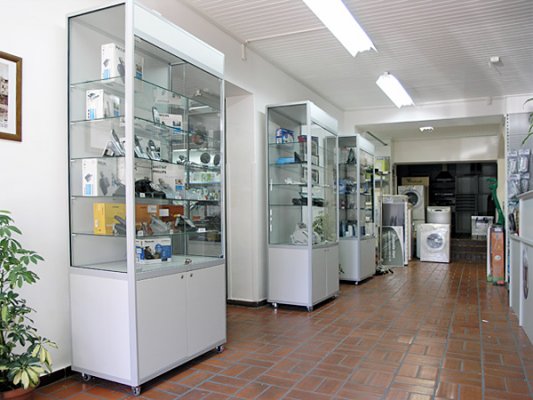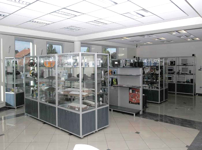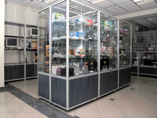 Foga glass showcases for technical goods are fully adaptable to individual customer needs. Glass display case in the lower part can be fitted wooden or glass boxes. There is a possibility of installing security lighting and locks.