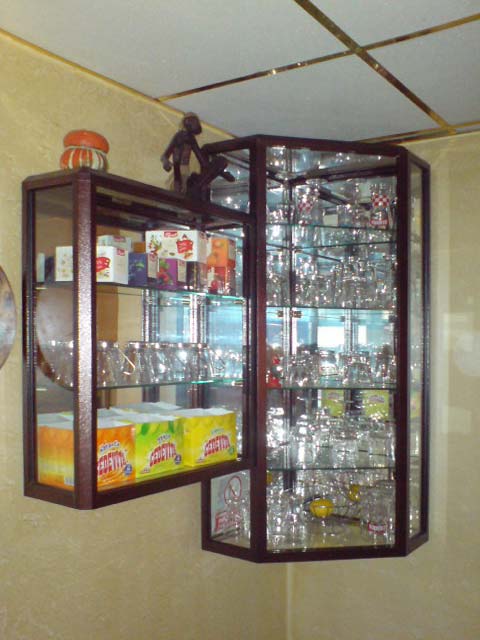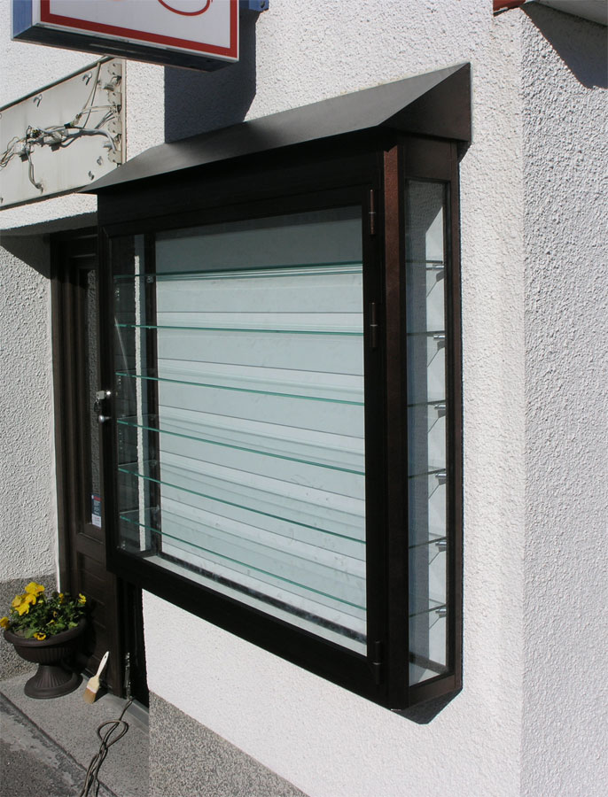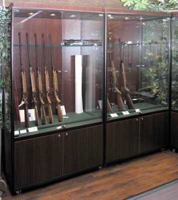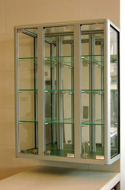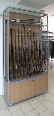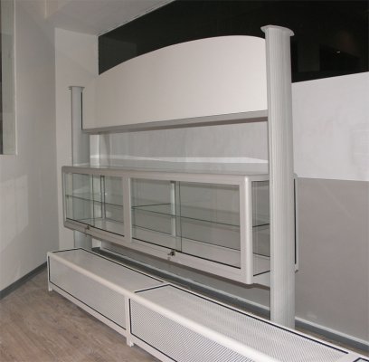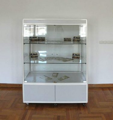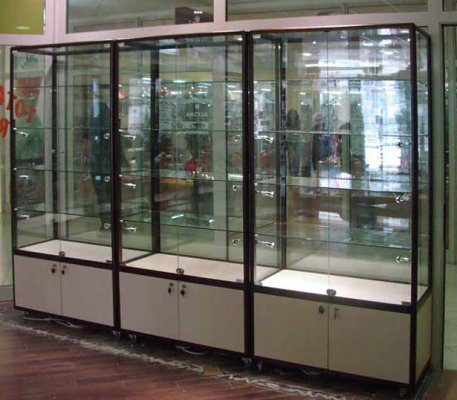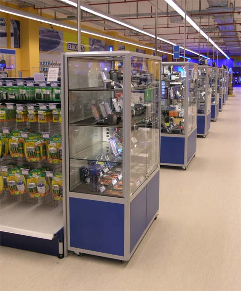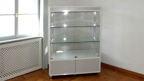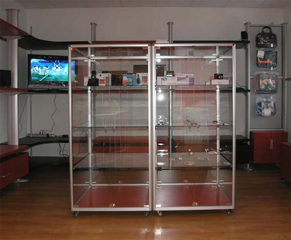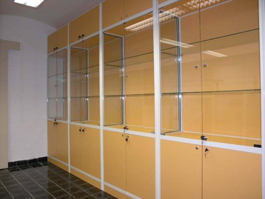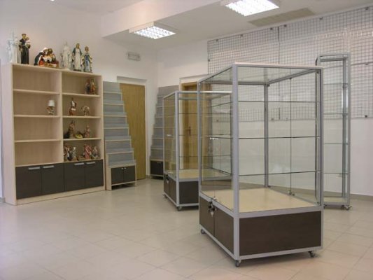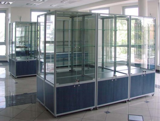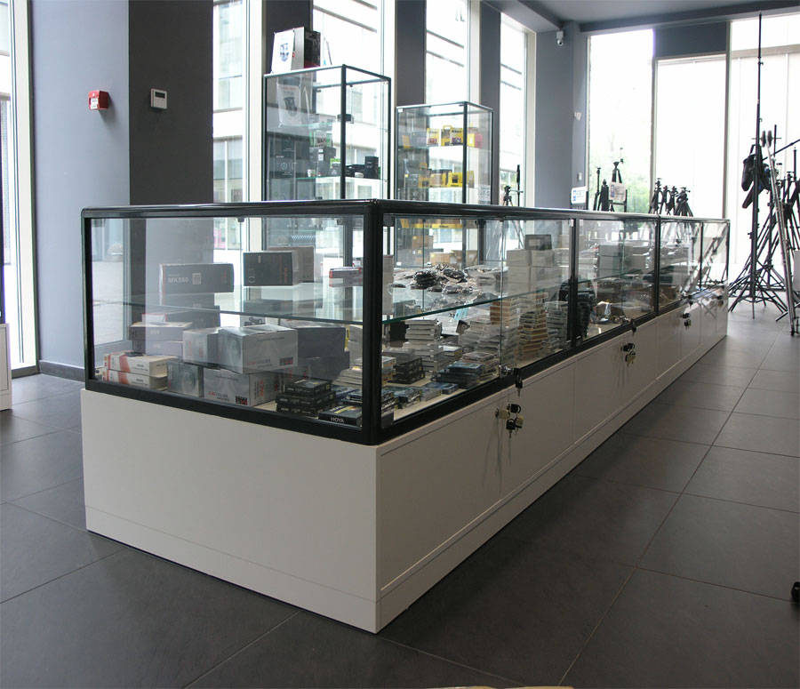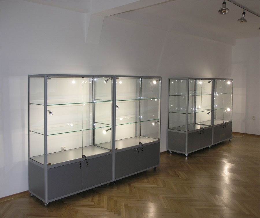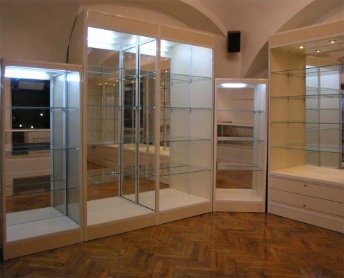 Foga glass showcases for technical goods are fully adaptable to individual customer needs. Glass display case in the lower part can be fitted wooden or glass boxes. There is a possibility of installing security lighting and locks.
