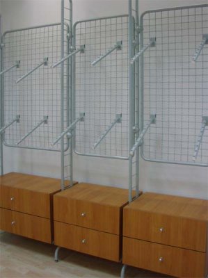 Zidne panele izrađujemo od oplemenjene iverice u preko 50 boja i dezena,te šliceve tj razmake za postavu polica za obuću ili odječu kao i raznih vješalica i stalaka radimo prema želji i potrebama kupca. Sve police napravljene su tako da su vrlo jednostavno sklopive, a imaju mogućnost jednostavnog podešavanja polica po visini.Na sve konstrukcije mogu se kombinirati police od različitih materijala od iverice,lima,stakla i dr. Aluminijska kao i ostale konstrukcije su ili eloksirane ili plastificirane u boju te izrađene u dimenziji po želji narućioca.