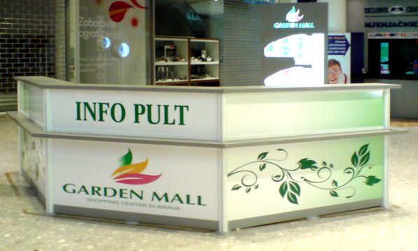 Za "Garden Mall", veliki trgovački centar u Zagrebu izradili smo informacijske pultove koji su izvedeni u bijeloj boji visokog sjaja, sa sivim metalnim okvirima.