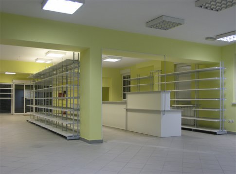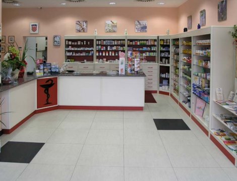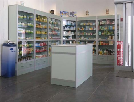 Uređenje prodajnog prostora ljekarni Tripolski u Osijeku: vitrine, police i prodajni pultovi.
